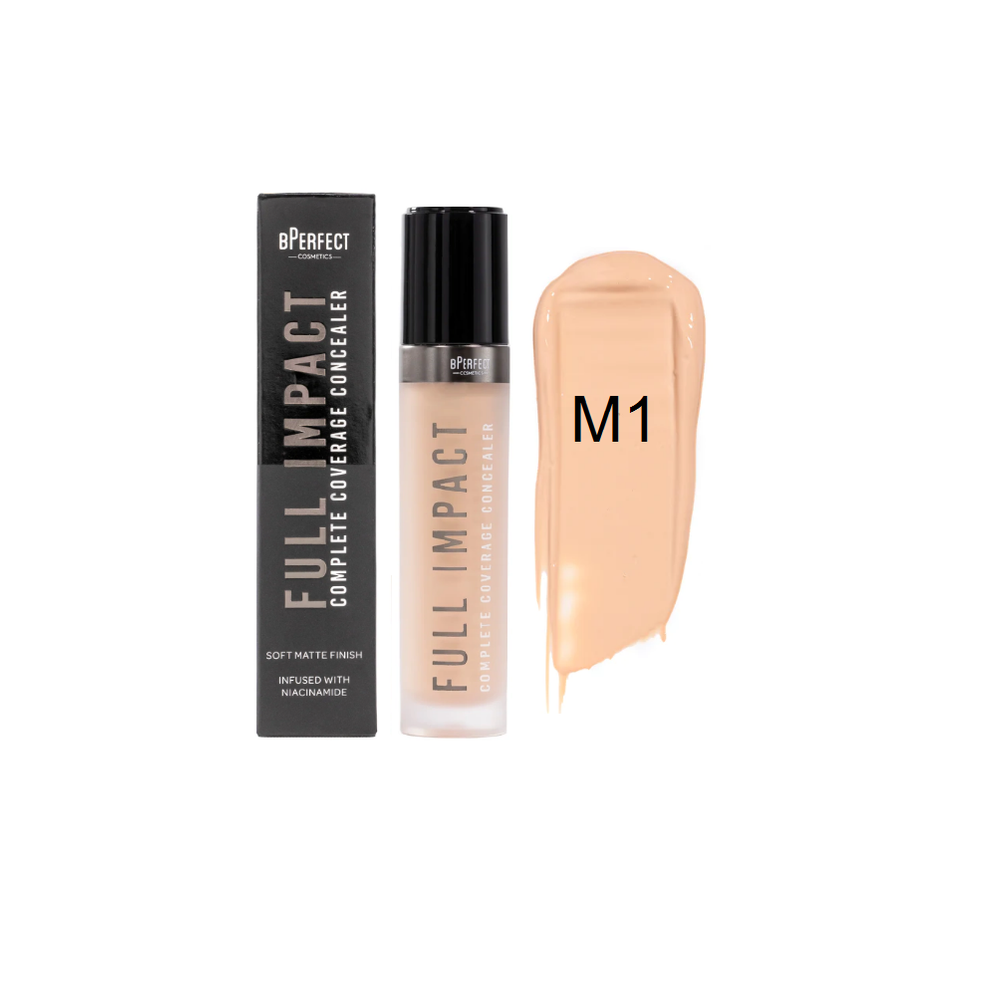 Korektor BPerfect Full Impact to kosmetyk do makijażu, o pełnym kryciu, dostępny w odcieniu M1, pasującym do jasnego do średniego odcienia skóry z neutralnymi żółtymi podtonami.